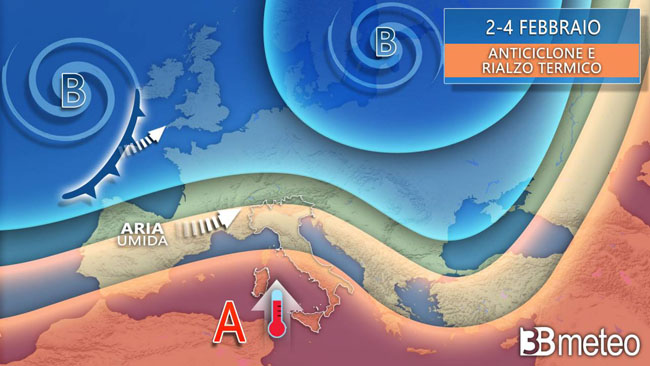 FEBBRAIO INIZIA MITE: il mese statisticamente più freddo dell'anno inizierà in controtendenza, con caratteristiche tutt'altro che invernali. Questo a causa dell'arrivo sul mediterraneo centrale di un promontorio anticiclonico di matrice sub tropicale richiamato verso nord dall'approfondimento di un vortice atlantico a ovest de Regno Unito. Dopo una domenica instabile e un lunedì ancora a tratti instabile la pressione tenderà così ad aumentare sull'Italia.