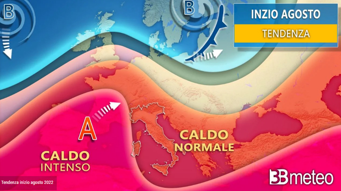 LUNEDI', ANTICICLONE IN RINFORZO. Con l'inizio del mese di agosto l'anticiclone africano tornerà ad alzare la testa e giorno dopo giorno diverrà sempre più robusto. Lunedì sarà una giornata stabile e in prevalenza soleggiata, anche se nelle ore diurne si attiverà una certa variabilità sulle zone alpine centro-orientali e sull'Appennino tosco-emiliano occidentale, con qualche rovescio o locale focolaio temporalesco. In serata però la coda di un fronte in movimento da ovest ad est sul centro Europa lambirà le Alpi, innescando altri temporali sui settori più orientali, destinati a sconfinare nella notte a parte delle pianure friulane e venete. Si intensificherà il caldo sulla Val Padana, sulle regioni tirreniche centro-settentrionali e sulle isole maggiori, con picchi anche di 36/38°C sull'entroterra toscano. Altrove invece il caldo sarà più sopportabile, in particolare lungo l'Adriatico centro-meridionale e sul basso Tirreno, dove difficilmente supereranno i 30°C.d