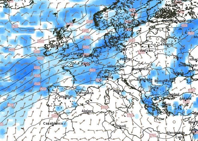 Metodo: La previsione si basa su carte del vento ad alta quota, che mostrano la direzione della corrente aerea misurata a 500mbar di pressione. Le etichette lungo le curve ( es. 5400, 5900,...) indicano, appunto, l'altezza in metri corrispondente alla pressione di 500 mbar. Il valore medio è 5500 metri. Un valore più alto indica anche un'alta pressione a livello del mare e viceversa. Quello che si deve guardare è la curvatura della corrente aerea. Se l'aria curva a sinistra, (moto antiorario), l'aria sale, si raffredda e crea una depressione, nuvole e pioggia. I fenomeni sono più forti se la curvatura a sinistra è stretta. Se la curvatura è a destra, (moto orario), l'aria scende, si riscalda e crea una compressione, con cielo sereno e caldo, con fenomeni tanto più forti quanto più la curvatura è accentuata. Se la curvatura non c'è, l'aria non sale nè scende, non si raffredda nè si scalda, ma solo trasporta l'aria, le nuvole ed il clima tipiche del luogo di provenienza della corrente aerea. Le carte mostrano, con il colore blu, più o meno intenso, le zone ove è prevista pioggia. Le frecce grigie indicano l'intensità e la direzione del vento a terra.