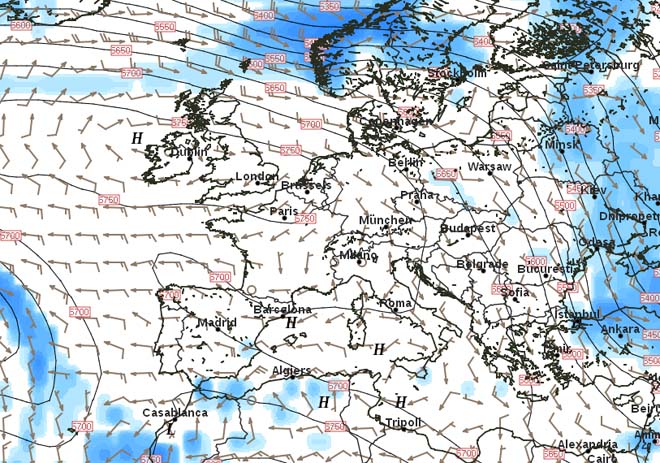 Metodo: La previsione si basa su carte del vento ad alta quota, che mostrano la direzione della corrente aerea misurata a 500mbar di pressione. Le etichette lungo le curve ( es. 5400, 5900,...) indicano, appunto, l'altezza in metri corrispondente alla pressione di 500 mbar. Il valore medio è 5500 metri. Un valore più alto indica anche un'alta pressione a livello del mare e viceversa. Quello che si deve guardare è la curvatura della corrente aerea. Se l'aria curva a sinistra, (moto antiorario), l'aria sale, si raffredda e crea una depressione, nuvole e pioggia. I fenomeni sono più forti se la curvatura a sinistra è stretta. Se la curvatura è a destra, (moto orario), l'aria scende, si riscalda e crea una compressione, con cielo sereno e caldo, con fenomeni tanto più forti quanto più la curvatura è accentuata. Se la curvatura non c'è, l'aria non sale nè scende, non si raffredda nè si scalda, ma solo trasporta l'aria, le nuvole ed il clima tipiche del luogo di provenienza della corrente aerea. Le carte mostrano, con il colore blu, più o meno intenso, le zone ove è prevista pioggia. Le frecce grigie indicano l'intensità e la direzione del vento a terra.