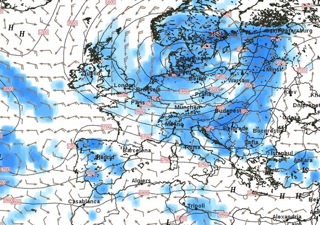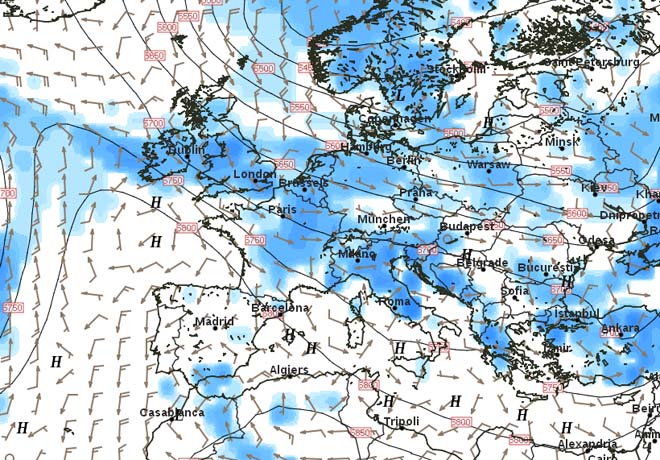 Metodo: La previsione si basa su carte del vento ad alta quota, che mostrano la direzione della corrente aerea misurata a 500mbar di pressione. Le etichette lungo le curve ( es. 5400, 5900,...) indicano, appunto, l'altezza in metri corrispondente alla pressione di 500 mbar. Il valore medio è 5500 metri. Un valore più alto indica anche un'alta pressione a livello del mare e viceversa. Quello che si deve guardare è la curvatura della corrente aerea. Se l'aria curva a sinistra, (moto antiorario), l'aria sale, si raffredda e crea una depressione, nuvole e pioggia. I fenomeni sono più forti se la curvatura a sinistra è stretta. Se la curvatura è a destra, (moto orario), l'aria scende, si riscalda e crea una compressione, con cielo sereno e caldo, con fenomeni tanto più forti quanto più la curvatura è accentuata. Se la curvatura non c'è, l'aria non sale nè scende, non si raffredda nè si scalda, ma solo trasporta l'aria, le nuvole ed il clima tipiche del luogo di provenienza della corrente aerea. Le carte mostrano, con il colore blu, più o meno intenso, le zone ove è prevista pioggia. Le frecce grigie indicano l'intensità e la direzione del vento a terra.